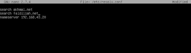 Jika sudah kita akan masuk dan edit di file resolv dengan perintah nano /etc/resolv.conf > tambahkan domain dan ip server seperti gambar dibawah > save dan exit.